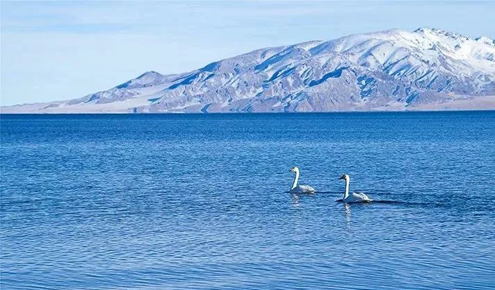 春天的賽里木湖,一半是湖水一半是冰面,湖邊依然堆積著白雪,湖中天鵝嬉戲,陽光灑下,猶如畫作般精致。