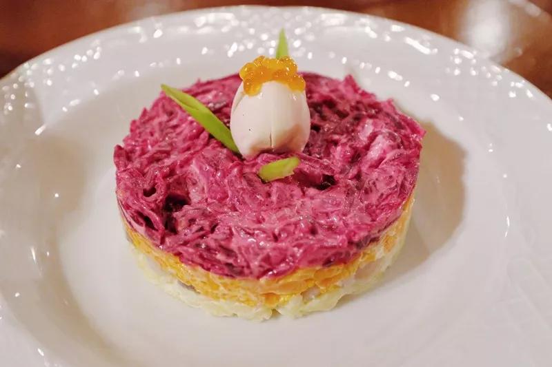 在海外傳播最廣的俄式料理非紅菜湯莫屬,即我們熟悉的羅宋湯。紅菜湯最早起源于烏克蘭,隨著俄羅斯文化傳入中國后,卻變成了另一個版本。大多數(shù)紅菜湯都不放甜菜,而是加大量番茄和土豆。真正的紅菜湯要保留甜菜鮮艷的紫紅色,湯底則用牛肉經(jīng)久熬成,需清澈入味,然后撒入新鮮蒔蘿,最后澆上一勺酸奶油才算完成。經(jīng)典款前菜是生腌鯡魚沙拉,一種是鯡魚切片搭配土豆,脂肪感滿滿,帶有濃郁的咸腥味和一點酸味。若想再狂野一些,不如來份牛舌沙拉,搭配小龍蝦是點睛之筆,兩樣看起來風(fēng)馬牛不相及的東西,居然完美融合。另一種版本顏值更高,吃起來也輕松許多,鯡魚、甜菜、土豆、胡蘿卜等都切粒后,一層層疊起來,變成色彩斑斕的圓柱形,澆上色拉醬,味道立刻小清新了。主菜不用說,罐燜牛肉會是最保險的選擇,各種香料和肉塊一起慢慢煨燉,直到香濃爛酥,濃濃的醬汁配上土豆、胡蘿卜等蔬菜一起吃,絕對是一道非常符合東方胃的西式菜。