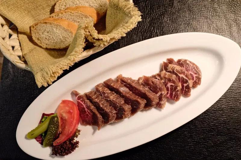 換個角度看,相比被各種加工食品和農(nóng)藥蔬菜包圍的我們,西伯利亞土著們的飲食才是純正的有機(jī)天然,無需繁復(fù)的烹飪手段和調(diào)味方式,自然的即是最美味。在新西伯利亞市最熱門的Puppenhaus餐廳,一道擺盤極其簡陋的煙熏生腌牛肉令人回味無窮。牛肉厚切,脂肪與瘦肉的比例恰到好處,肉質(zhì)柔軟緊實,微微呈紅褐色的肉片發(fā)出迷人的光澤,煙熏的風(fēng)味沒有濃烈到臘香的程度,而帶有果木的清香。