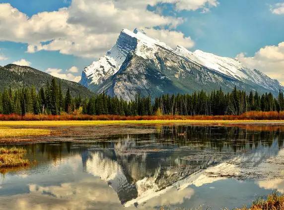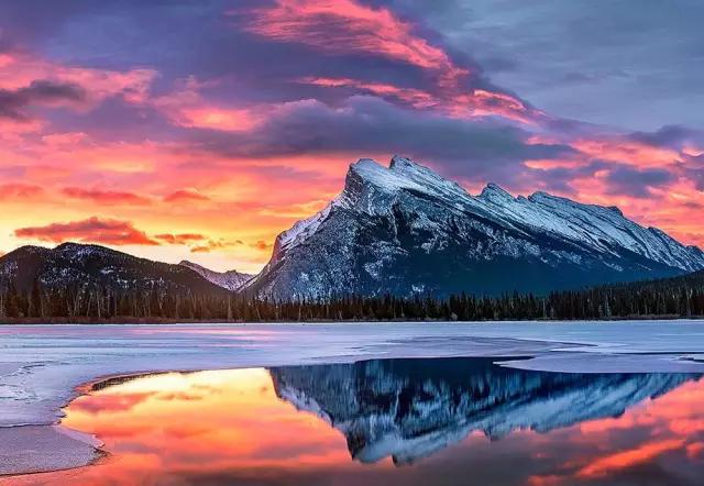 而畫面中如明鏡般純凈的美湖就是著名的朱砂湖(Vermilion Lakes)。朱砂湖距離班夫鎮(zhèn)3公里,此處是日出最漂亮的地方,也是整個落基山最富盛名的攝影地之一。