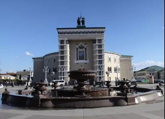 旁邊就是烏蘭烏德的民族劇院,黃色建筑的上方有戰(zhàn)馬嘶鳴的銅像。門口不遠處有展牌,上面是演出預告和海報。