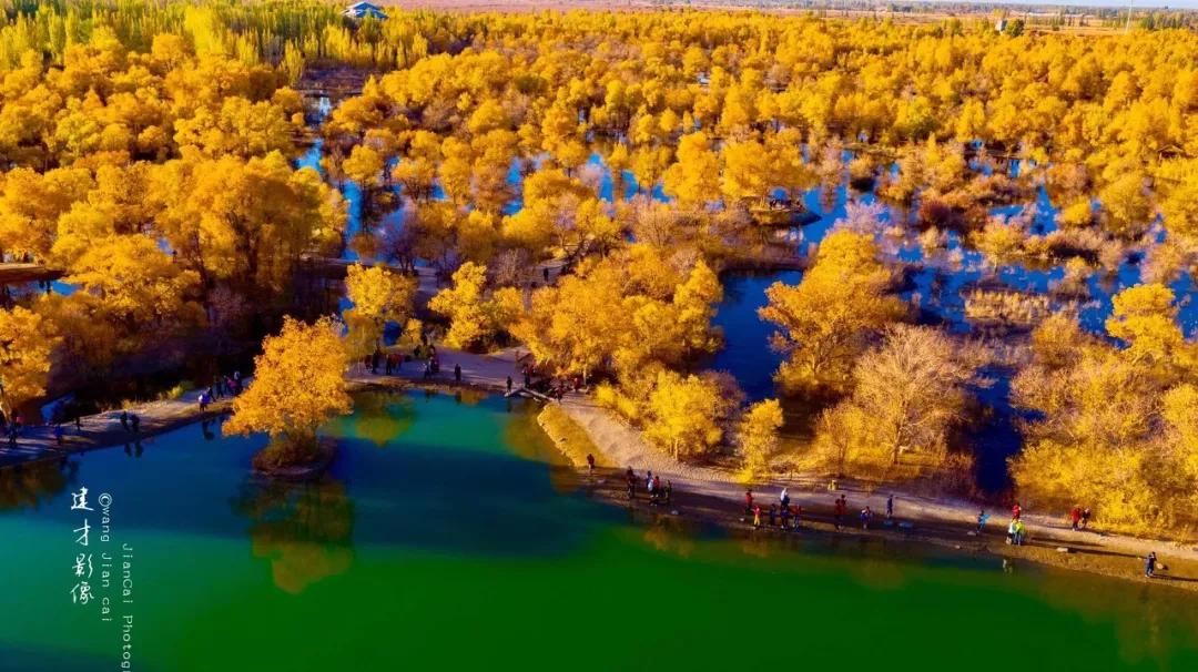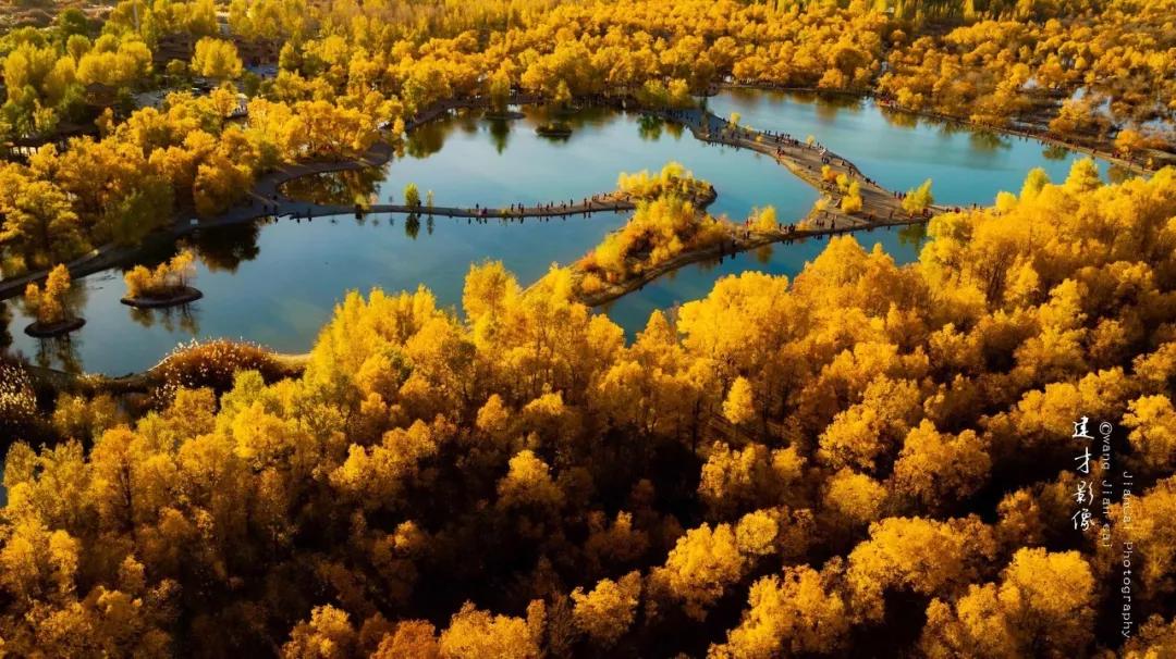 在甘肅省酒泉市金塔縣,八萬多畝人工胡楊林化為一片金黃,在一池碧水的掩映下,如同一把把火炬,閃爍著耀眼的金光。