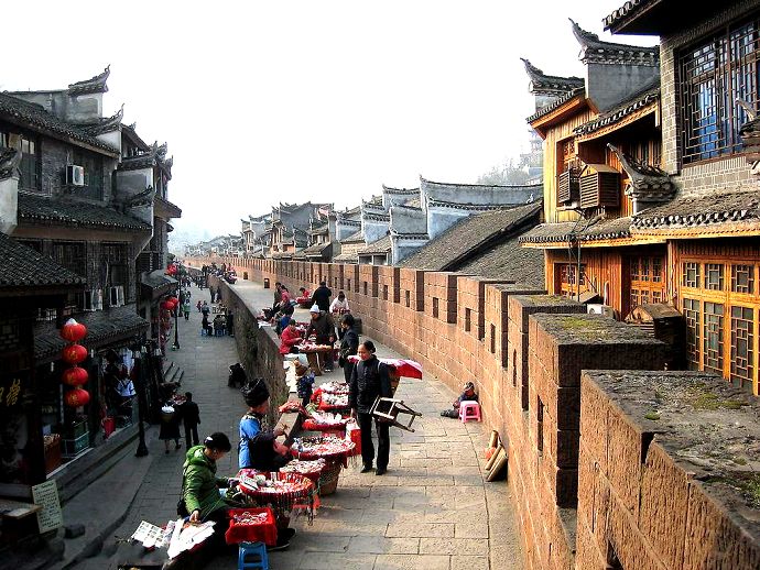 寬不足5米的青石版街,自道門(mén)口往西,經(jīng)十字街、東正街、西正街、回龍閣、營(yíng)哨沖、陡山喇、接官亭、沈從文墓地直至天下第一泉,全長(zhǎng)3000多米。是鳳凰最繁華的商業(yè)街。道兩旁的建筑、街巷,都能讓您飽覽古鎮(zhèn)的萬(wàn)種風(fēng)情。