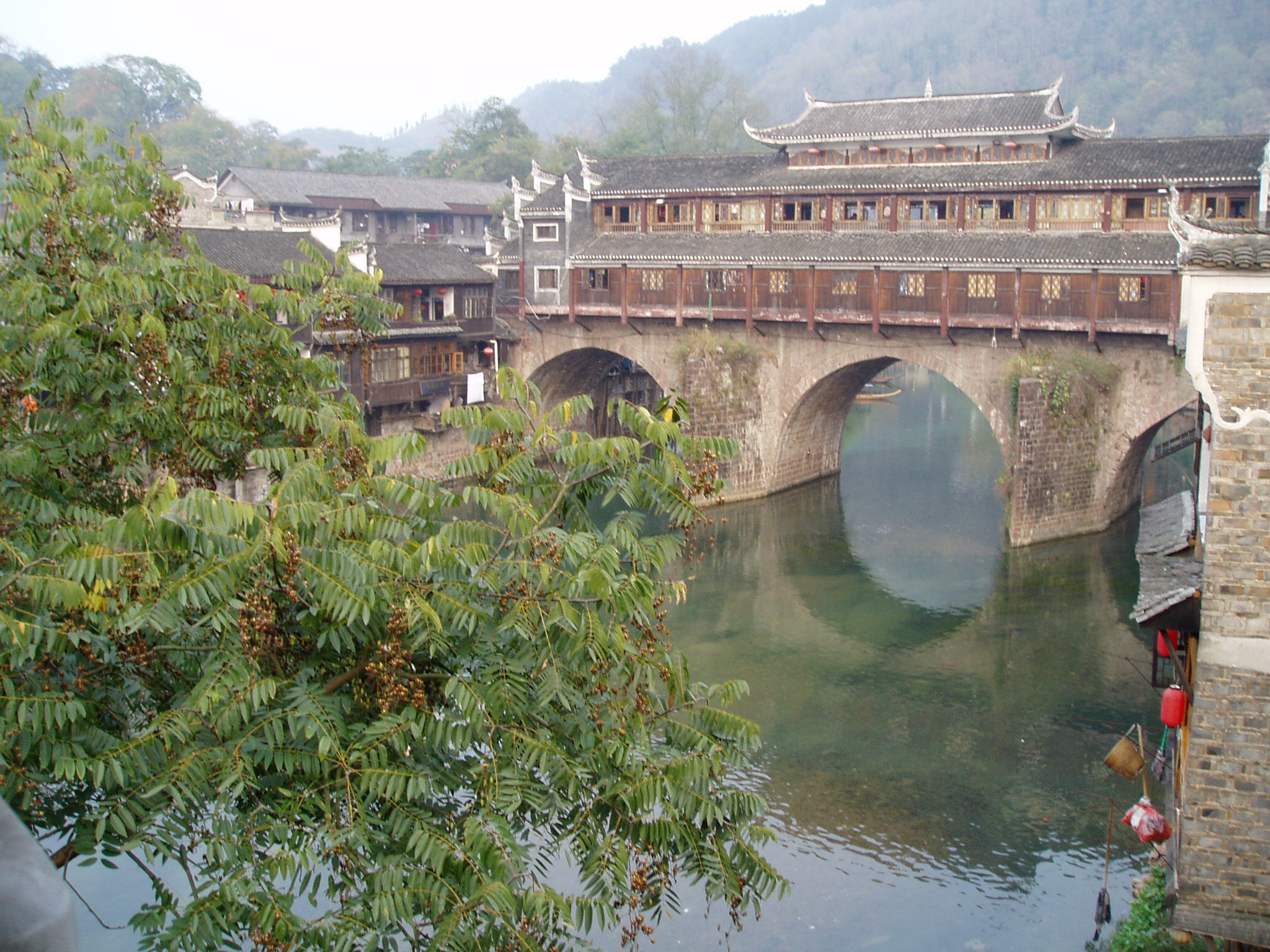虹橋橫臥于沱江之上,風(fēng)雨樓以它的壯觀(guān)和俊美拔然而起,這其實(shí)就是成了一道重疊的風(fēng)景,這道風(fēng)景,由下而上、由古而今穿越著六百多年的歷史。 這座橋始建于明洪武初年,頗信風(fēng)水的鳳凰人都說(shuō),這座橋斬?cái)嗟氖且粭l龍頸,令一條巨龍身首異處。怪只怪那位和尚出生的安徽小子朱元璋,聽(tīng)信一位從昆侖山開(kāi)始追索一支龍脈,經(jīng)云貴高原來(lái)到五寨司城的陰陽(yáng)先生的讒言,說(shuō)這兒屏立南郊?xì)鈩?shì)非凡的南華山和與之一脈相承一頭扎入沱江的奇峰,就是他要尋找的龍頭。并由此推斷出總有一天這地方會(huì)有人出來(lái)問(wèn)鼎中原,真命天子將出。那位朱皇帝豈能允許邊遠(yuǎn)的鳳凰有他潛在的對(duì)頭于是朱筆一勾,龍頸被斬,鳳凰風(fēng)水遭毀滅性破壞,鳳凰再也出不來(lái)皇帝了。