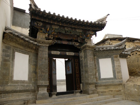 垂花門(mén)樓的大門(mén),是瓦屋頂,三疊水式楹。門(mén)頭上方高懸著三重錯(cuò)落有致、優(yōu)雅精美的檐枋,上面分別雕鏤出富有寓意的圖案:第一重檐枋上透雕出幾尾游魚(yú)和兩條金龍,寓意為“魚(yú)躍龍門(mén)”;第二重檐枋上鏤出朝陽(yáng)和四只喜鵲,寓意為“四喜臨門(mén)”、“蒸蒸日上”;第三重檐枋上鐫刻著佛手、桃梨、香爐、寶瓶等物,象征著“福祿壽”。旁邊雕斗上鏤空的金馬、碧雞,寓意“金碧輝煌”。金馬、碧雞傳說(shuō)是古代滇池邊的兩種神物,如今已經(jīng)成為云南的象征之物。 在大門(mén)前,有一對(duì)刻著龍鳳圖案的石鼓,據(jù)說(shuō)兩個(gè)石匠花了一年的功夫才大功告成。兩個(gè)石匠把他們這件生命的杰作交給世人;朱氏家族用銀兩和心血留下了這幢華麗的建筑。