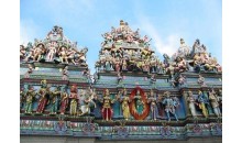 維拉瑪卡里雅曼興都廟(Sri Veeramakliaman Temple)建于1855年。特殊的彩繪門樓屬典型的南印度建筑風(fēng)格,門上高聳的塔樓上裝飾許多立體的彩色神像,廟里則是供奉主掌生死的"卡莉女神"(Kali)。雕刻在門樓上的印度教諸神與圣物牛、斗士等,在太陽(yáng)的照耀下閃閃發(fā)光,耀人眼目。寺廟周圍的墻壁,都被涂成紅白色,極富喜慶氣氛。