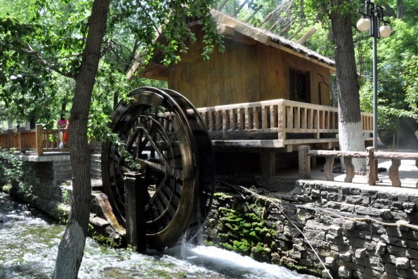 水磨河從龍口泉一直蜿蜒流淌到景區(qū)大門,河水清澈,兩岸綠樹成蔭,是整個水磨溝景區(qū)最靈動的部分。在靠近龍口泉的河邊,有座水磨坊,這是一座再現(xiàn)歷史景觀的仿古磨坊。據(jù)說,清乾隆年間,當?shù)毓俜胶兔耖g曾利用水磨溝的水力,在這里置辦水磨坊一百多間,為駐軍和居民加工食糧,水磨河和水磨溝也正因此得名,后來,隨著磨制工具的更新,原有的水磨坊逐漸絕跡。現(xiàn)在看到的這座磨坊是1992年的仿古建筑。