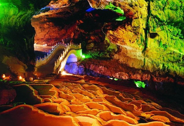 洞內(nèi)有無數(shù)千姿百態(tài),瑰麗多彩的鐘乳石,游覽范圍共分三層:上中兩層為陸地層,廳堂高大寬闊,巖壁堅(jiān)固,雄偉壯觀,“瀑布”“山林”“谷”“田園”“瑤寨”百花爭艷,鳥飛云走……;下層是一條地下暗河,由北向南蜿蜒1500米,經(jīng)過三個(gè)美麗的峽谷,穿過四座山頭底部,河面寬1.6米,水深1-7米,兩岸奇景密布,巧奪天工,美不勝收。有洞中之寶”金雞報(bào)喜”飛象過河”還有地下河最高最大,版權(quán)所有山東聊城聊之旅國際旅行社有限公司,轉(zhuǎn)載必究!一物兩景的“壽星公”“飛瀑奇石”“花鳥神閣”……。各處自然美景無不讓人吧為觀止。樂而忘返!