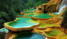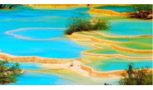 這一片景觀,還有緊傍森林的明鏡倒影池、掩映于杜鵑花叢間的婆蘿彩池和擁有彩池500多個(gè),鈣化景觀中色彩最為豐富的爭(zhēng)艷池。