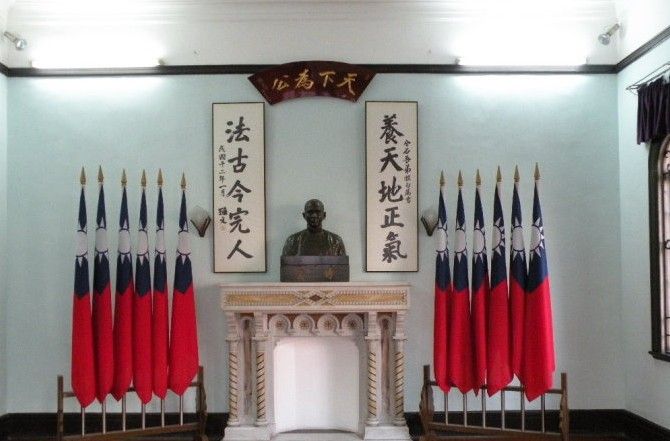 鐵門兩邊原本鑲有中國國民黨黨徽。「一二•三事件」發(fā)生後,當(dāng)時(shí)的澳門市行政局在1967年1月2日發(fā)出公告,禁止在澳門懸掛和顯示敵對(duì)中華人民共和國的外國旗幟、徽章和標(biāo)志。次日,澳門政府派員到該館拆除鐵門,并以專門訂造的,沒有中國國民黨黨徽?qǐng)D樣的鐵門取代。不過,展覽館內(nèi)孫中山先生半身像兩旁仍然可以展示中華民國國旗,成為澳門唯一一處可以公開展示中華民國國旗的地方。