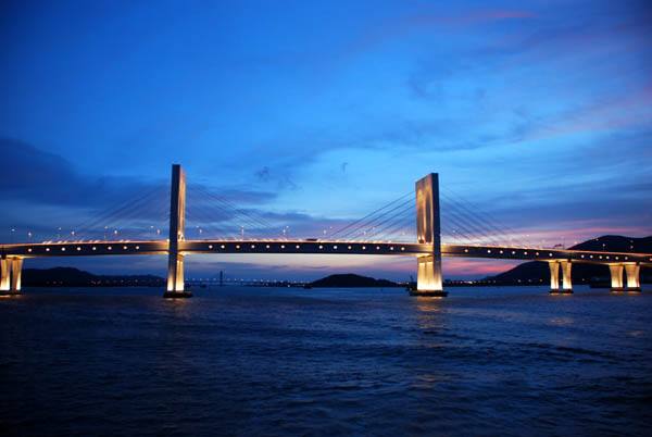 澳門“友誼大橋”,工程原稱新澳氹大橋,1994年初建成通車。位于舊大橋(嘉樂庇總督大橋)以東,連接澳門半島新口岸水塘北角(外港碼頭處)與氹仔北安碼頭。橋?qū)?5米,設(shè)兩條雙線車道,中設(shè)分隔線,車道兩旁設(shè)1.5米寬的行人道。