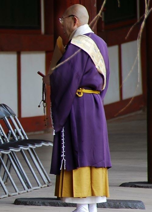 為國家和萬民悔過,須有特定的集團和大型儀式。因此,由僧團共同舉行法會以悔過,修二會便是其中的儀式之一。僧侶被稱為“練行眾”,現(xiàn)在由11人組成,分工各不相同。授戒師、大導(dǎo)師、結(jié)印誦唱陀羅尼咒的咒師,及總管修二會內(nèi)外雜務(wù)的堂司等4人被稱為四職,其余7人名平眾,而且還有許多人輔佐練行眾,直接參加法會的人多達30余名。