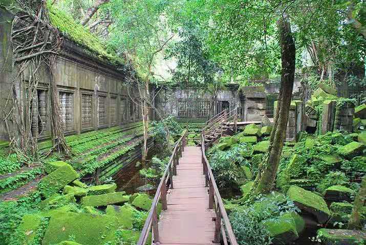 崩密列的護(hù)城河長(zhǎng)1.2公里,寬0.9公里,它和吳哥寺幾乎一樣大的規(guī)模,但依然被叢林嚴(yán)密包裹著。由于比較荒僻,所以很多浮雕和塑像已被掠奪,但寺廟的神秘氣氛仍舊在森林深處彌漫。