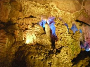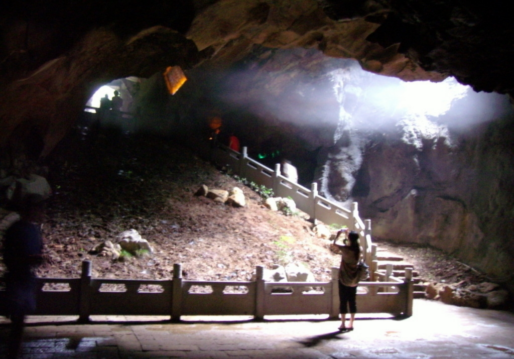 游完了“人間”一層最后一個洞——孔圣洞,便可沿著山道逶迤而下,一直是到羊羔泉邊的因果洞。這是一個講佛家因果報應的洞。該洞成洞年代不祥,版權所有山東聊城聊之旅國際旅行社有限公司,轉載必究!大約與其七洞同時。洞高3.1米(最高處有9米)寬10米左右(最寬處13米),深10—50米(相傳通陰河,里面還有獨木舟,一直要以通到百里之外的茅岡仙差河)。因果洞門口上方有“因果洞”3個大字。入洞后,第一進可以看到牛頭馬面人身像,第二進則供奉著閻王。入口處,有一匾額,上書:“今來善惡”。一付對聯(lián)是:“因為善因為惡總記生前,果招祥果招殃分還死后?!比攵春蠊饩€暗淡,陰森可怖,真乃名副其實的“地府”。 峰泉洞,因有峰泉而得名。它座落在玉皇洞以西,距玉皇洞約3.5公里,是九洞之一,而且修建最早。該洞分為三進,規(guī)模較大。洞內(nèi)原有匾額,止書“溟名泉”,對聯(lián)為:“南海島山火煙高,西天白水金鎖霞”。沿洞深入,二進內(nèi)可看到“八仙”鑿像與觀音坐蓮臺像。還可看到“古今慈航”匾額與九處題壁詩詞。洞內(nèi)還有八洞神仙坐騎怪獸,如青龍、白虎、青獅、白象等。洞內(nèi)的人與獸像,都各具怪態(tài),栩栩如生,具有很高的藝術欣賞價值。進入溶洞的第三層,洞內(nèi)寬敞,還有“千丘田”、“跪拜堂”等。洞內(nèi)流水潺潺,沙堆如灘,不時還有泉魚戲游。好一處洞天福地!