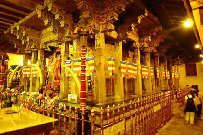 每層小金塔內(nèi)藏著各國佛教徒供奉的珍寶,最后一個小金塔不到1米高,塔頂飾有一枚鉆石,塔里有一朵金蓮花,花芯有一玉環(huán),長約5厘米的佛牙就安放在這玉環(huán)的中間。每日早、中、晚3次在震懾人心的鼓樂聲中,由3位高僧,分持3把不同的門匙開啟內(nèi)殿大門,進入內(nèi)殿,版權所有山東聊城聊之旅國際旅行社有限公司,轉載必究!舉行隆重的敬拜儀式,儀式之后再開啟內(nèi)殿拱門,讓信徒與游人從門外魚貫瞻仰供奉佛牙的佛牙塔。佛牙寺四周有高墻圍繞,圍墻四角各建有一廟,即納特(觀音)廟、摩訶廟、卡多羅伽摩廟和帕蒂尼女神廟,據(jù)說這4座廟是為了保護佛牙建立的。