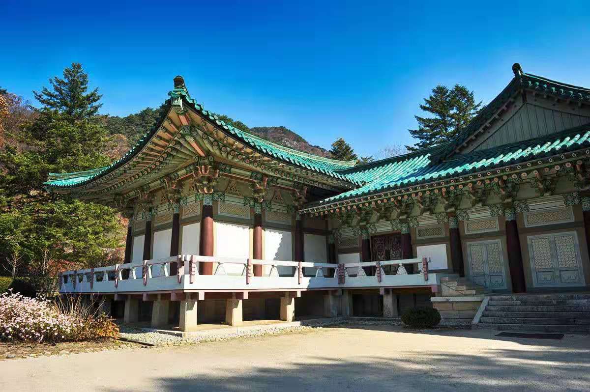 大雄殿門扇鏤刻著不同的、奇異美妙的圖案。刀法純熟,鏤木如玉。大殿上方的彩色斗拱,完全是木質(zhì)結(jié)構(gòu),卯隼相合,斗椽交叉,層層疊起,處處描金,畫中有雕,雕中套畫,體現(xiàn)了古代朝鮮巧奪天工的建筑藝術(shù)。