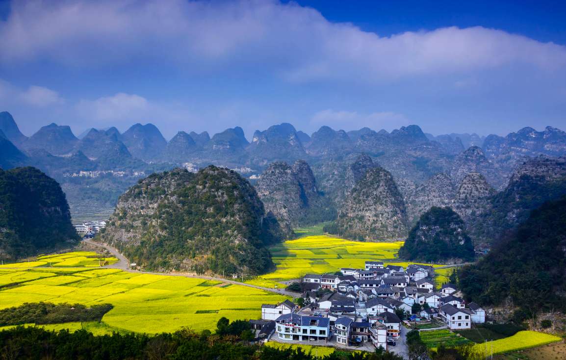 萬畝油菜花:萬畝油菜花盛開在烈烈暖陽下,在層疊的峰林間,一座座峰林在初春的日光下延伸到天邊。山下是燦爛明黃的大海般的油菜花田,不知名的村寨掩映其中若隱若現。遠處青山如黛,近處大片大片的油菜花開得熱烈燦爛。