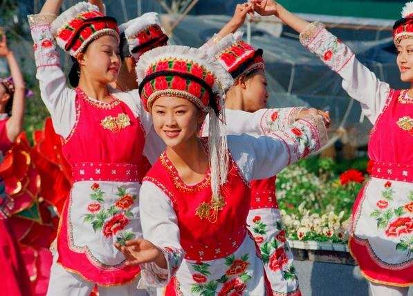 女子腰身苗條、婀娜,衣著色彩鮮艷、明快又大方。尤其是她們的繡花包頭,體現(xiàn)了大理的“風花雪月” 四景??矗瑥潖澋陌^像洱海里的新月;艷麗的朵朵繡花代表了上關(guān)花;頂端潔白的纓須像蒼山頂?shù)陌籽?;耳際垂下的纓穗隨風飄灑,顯示了下關(guān)的風。