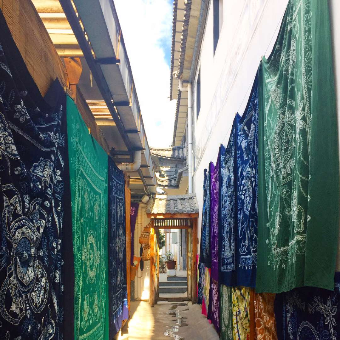 在周城,你還可以看到豐富的民族扎染制品。扎染是周城白族人民明末清初以來的民間傳統(tǒng)工藝,扎染工藝品集文化、藝術(shù)為一體。扎染布由手工針縫線扎,反復(fù)冷染浸制而成,顯色青里帶翠,凝重素雅,精工制作,圖案清新,色彩絢麗,遠銷海內(nèi)外。用扎染布制作的工藝品既充滿濃濃的民族風味,也很具現(xiàn)代韻味。