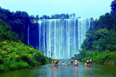 竹筏穿瀑云霧溫卷,彩虹生輝,在陽光的照射下,瀑霧處處成虹。隨陽光強弱,觀賞角度的變化而變化。游客乘坐竹船漂流于湖面之上,觀瀑觀景便能達(dá)到只身如畫不是夢的境界。