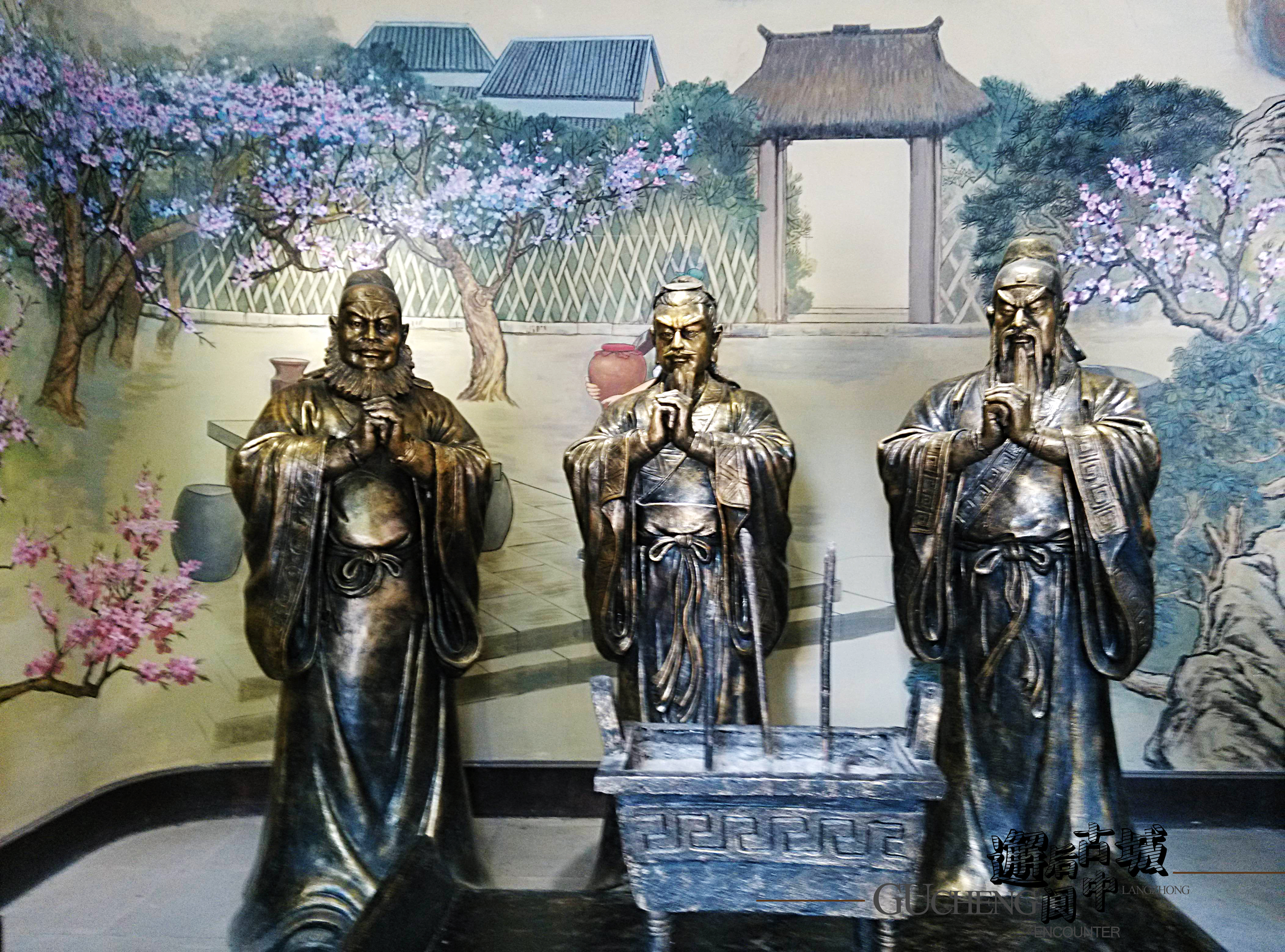 踏上陡峭的臺階走上二樓,劉、關(guān)、張?zhí)覉@三結(jié)義的雕塑面江而立,率先映入眼簾。