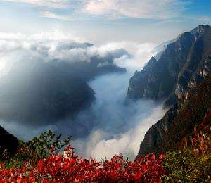 上升峰海拔高度780米。位于神女溪東岸6公里處,七里塘東側(cè)。上升峰山勢(shì)險(xiǎn)峻峭拔,尖峰高突,巍然屹立。其一角斜上,飄飄欲飛,直上云霄,猶如巨鳥飛升九天。因此得名上升峰。又因峰形似鯤鵬展翅,扶搖直上,當(dāng)?shù)匕傩沼址Q它為老鷹巖。到達(dá)上升峰頂,可以遠(yuǎn)看萬里長(zhǎng)江,截?cái)辔咨皆朴辏凰简v,萬峰峭拔。還可看到大寧河從莽莽群峰間穿行,猶如飄在群山間的銀帶。