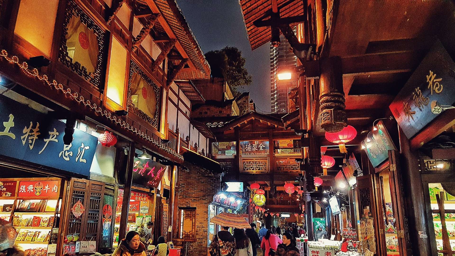 展現(xiàn)的是“另類美食城”的景色,位于第4層,集中了中外名店。臨江一面有工匠當(dāng)街打糍粑、切桃片、烤制花生糖,以及現(xiàn)場演繹美食特產(chǎn)制作工藝,臨崖一面有小吃店,旦旦面、豬兒粑、大湯圓、歌樂山辣子雞、黔江雞雜,老重慶毛血旺等。