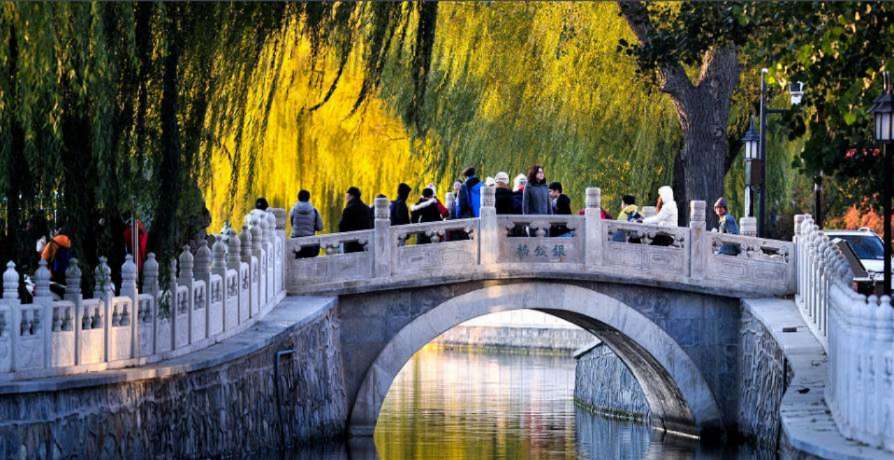 在橋身正面鐫刻著由故宮博物院副院長單士元老先生題寫的“銀錠橋”三個楷體大字。字體工整渾厚,滿著綠色,與周圍的碧水、高楊、翠柳相融。橋下水波粼粼,金光閃閃,橋畔楊柳夾岸,蔥蘢流翠;橋周圍古宅相擁,胡同密集,古韻悠然;隱于濃蔭中的王府、寺廟的屋頂飛檐依稀可見;橋的近處還有宋慶齡、郭沫若等多處名人故居,一派清雅幽靜的氛圍。別看銀錠橋橋體不大,卻是什剎海景區(qū)的點睛之筆。