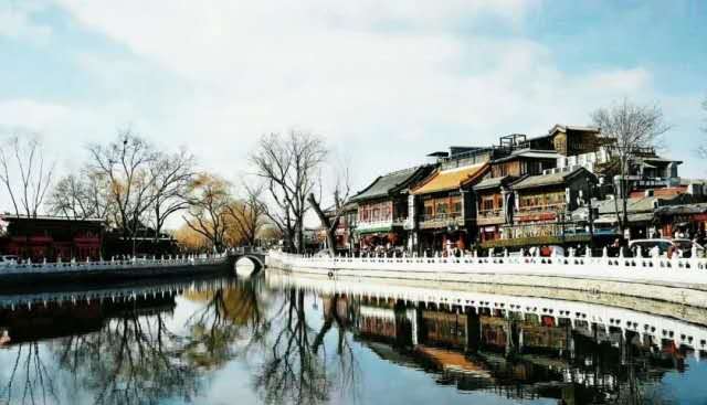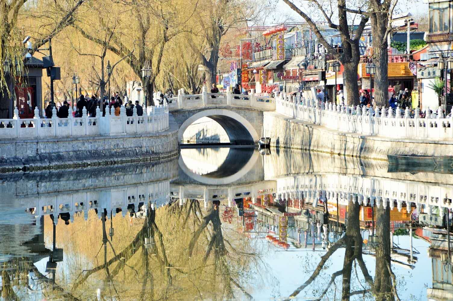 元代營建新大都后這里已是船泊必經(jīng)之處,兩岸商事繁華,又是風景勝地。遼、金時代雖是郊外,數(shù)公里長的水系兩岸也應(yīng)有便橋方便來往。明代史籍已有明確的記載。解放初期,當我們站在銀錠橋頭平目西望,遠處藍天下的青山綿延起伏,湖邊搖曳的柳絲楚楚動人,猶如掛在空中美麗的巨幅圖畫,每當夕陽西下,金色的余輝從山后撒播在湖面上,微波粼粼,金光閃閃,迷人的湖光山色令人流連忘返,可惜后來的煙囪和高樓大廈嚴重地破壞了京城這難得的獨特景觀,但愿這遺憾和教訓不再發(fā)生。