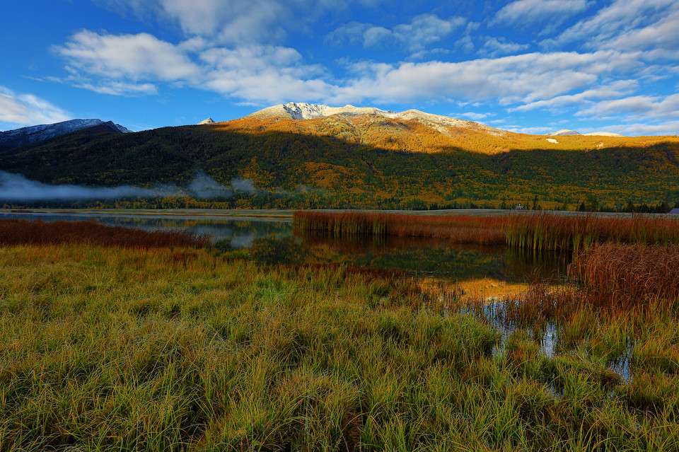 鴨澤湖位于禾木喀納斯蒙古族鄉(xiāng)境內(nèi)喀納斯村南邊,它是由喀納斯河改道后廢棄河段——牛軛湖洼地組成,呈長形蝶狀,沿洼地南端形成一個南北走向的寬淺湖泊,形似蝶狀的一弘碧水與沼澤濕地連為一體,面積約1.3 平方公里。