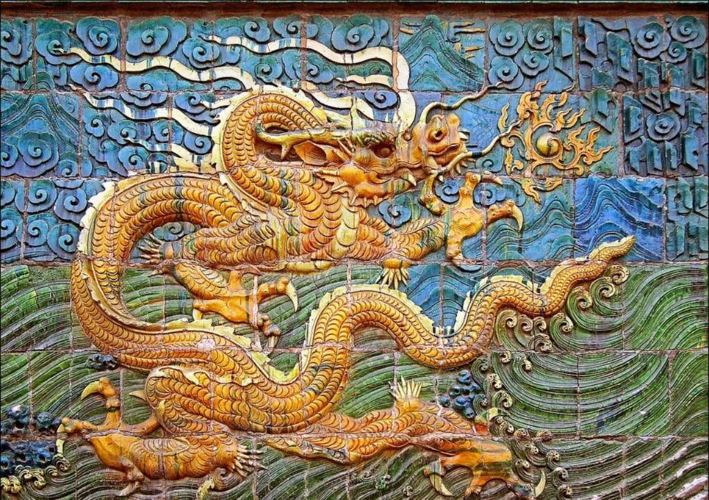 壁高8米,厚2.02米,長(zhǎng)45.5米,僅壁身的九龍壁主體,高度就有3.72米。壁上均勻協(xié)調(diào)地分布著9條飛龍,以飛騰之勢(shì),躍然壁上,活靈活現(xiàn)。正中一條龍,是九龍的中心,它龍頭向前,龍尾擺動(dòng),黃色的主體,鱗光閃爍。主龍兩側(cè)的兩條龍互相對(duì)稱,構(gòu)成一幅生動(dòng)的畫面。龍的間隙由山石、水草圖案填充,互相映照、烘托。壁身兩側(cè)為日月圖案,由426塊特制五彩琉璃構(gòu)件拼砌而成,壁頂覆蓋琉璃瓦,頂下由琉璃斗拱支撐。壁底為須彌座,高2.09米,敦實(shí)富麗,上雕41組二龍戲珠圖案。腰部由75塊琉璃磚組成浮雕,有牛、馬、米、狗、鹿、兔等多種動(dòng)物形象,生動(dòng)活潑,多彩多姿。整個(gè)九龍壁構(gòu)圖協(xié)調(diào),比例適當(dāng),風(fēng)格古樸、穩(wěn)重、端莊。