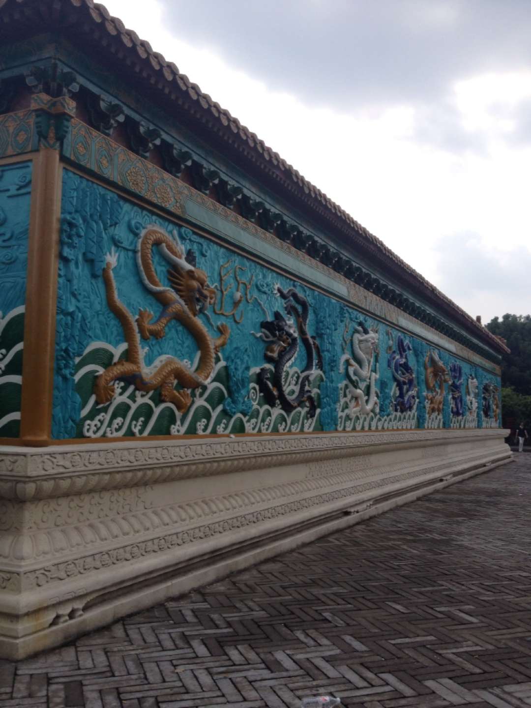 九龍壁前,修筑一處倒影池,中段有石橋讓行人穿行。龍?jiān)谒械褂?,把靜態(tài)的龍變成動(dòng)態(tài)的龍,可謂匠心獨(dú)運(yùn)。
