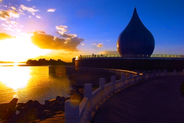 黃河宮主體建筑高36.9米,創(chuàng)意采用唐朝詩(shī)人李白“黃河之水天上來(lái)”的詩(shī)詞寓意,將黃河之水凝練成水滴建筑形態(tài)。建筑里沿內(nèi)壁有人行觀景坡道,中間設(shè)電梯和80多平方米的觀景臺(tái)。水滴主體建筑下就是黃河博物館。