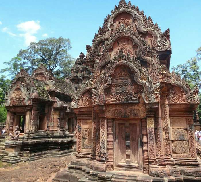 女皇宮采用高棉特有的紅土建造,色彩極為艷麗。含有大量水分的紅土既便于運(yùn)輸、建筑,也利于雕刻復(fù)雜細(xì)膩的圖案。而建筑建成后,經(jīng)過風(fēng)干,就變得異常堅(jiān)硬,千年不壞。