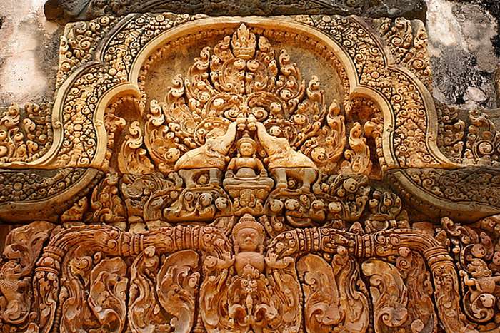 女皇宮的墻壁、立柱、門楣等建筑表面幾乎完全被浮雕覆蓋,沒有一點(diǎn)空隙。女皇宮浮雕刀工流暢細(xì)膩,造型繁復(fù)圓潤(rùn),線條纖巧柔美,色彩鮮艷嫵媚,在所有吳哥浮雕中首屈一指,被譽(yù)為“吳哥藝術(shù)之鉆”。
