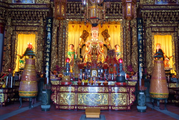 天后宮大殿同樣是木石結(jié)構(gòu),金黃色琉璃瓦屋面配以閩南式燕尾大脊,脊頂以彩瓷塑“雙龍朝寶塔”,飛檐有各色堆剪和卷草花飾,殿前臺(tái)明正面砌六幅青石浮雕,踏步中部嵌一幅“九龍勝云”浮雕御路石,整座大殿外觀氣勢(shì)恢宏。版權(quán)所有山東聊城聊之旅國(guó)際旅行社有限公司,轉(zhuǎn)載必究!大殿前廊八根圓形透雕青石大龍柱及大量石雕,絳紅色榔扇門窗,繪有大量寓意喜祥如意的圖案。大殿梁柱間的大部分彩繪以媽祖故事為主題,描金厚彩,富麗堂皇。殿內(nèi)供奉一尊高三點(diǎn)八米、寬二點(diǎn)一米的媽祖坐像。