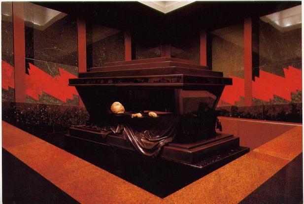 1924年1月21日6時(shí)50分,列寧在莫斯科附近的哥爾克村與世長辭。25日,阿·舒謝夫做成陵墓設(shè)計(jì)草圖,在1924年1月27日就匆匆趕建成一座木質(zhì)結(jié)構(gòu)的臨時(shí)性陵墓,里面安放著列寧的水晶棺。
