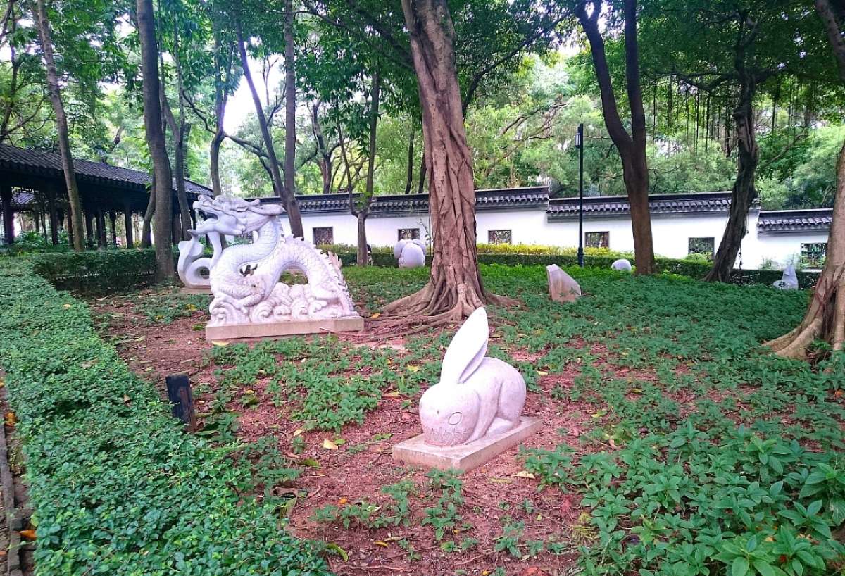 此庭位于衙門(mén)西側(cè),布局猶如“園中園”。庭內(nèi)擺放各式形態(tài)獨(dú)特的嶺南盆景,矮樹(shù)叢的“龍”、“鳳”造形修 葺得栩栩如生;而地上由卵石、啤酒樽、碗碟碎片鋪砌而成的“五蝠壽鶴圖”則維肖維妙。園內(nèi)植有四季花卉,置身其中,四時(shí)景致盡現(xiàn)眼前,為寨城八景之“四季同馨”。