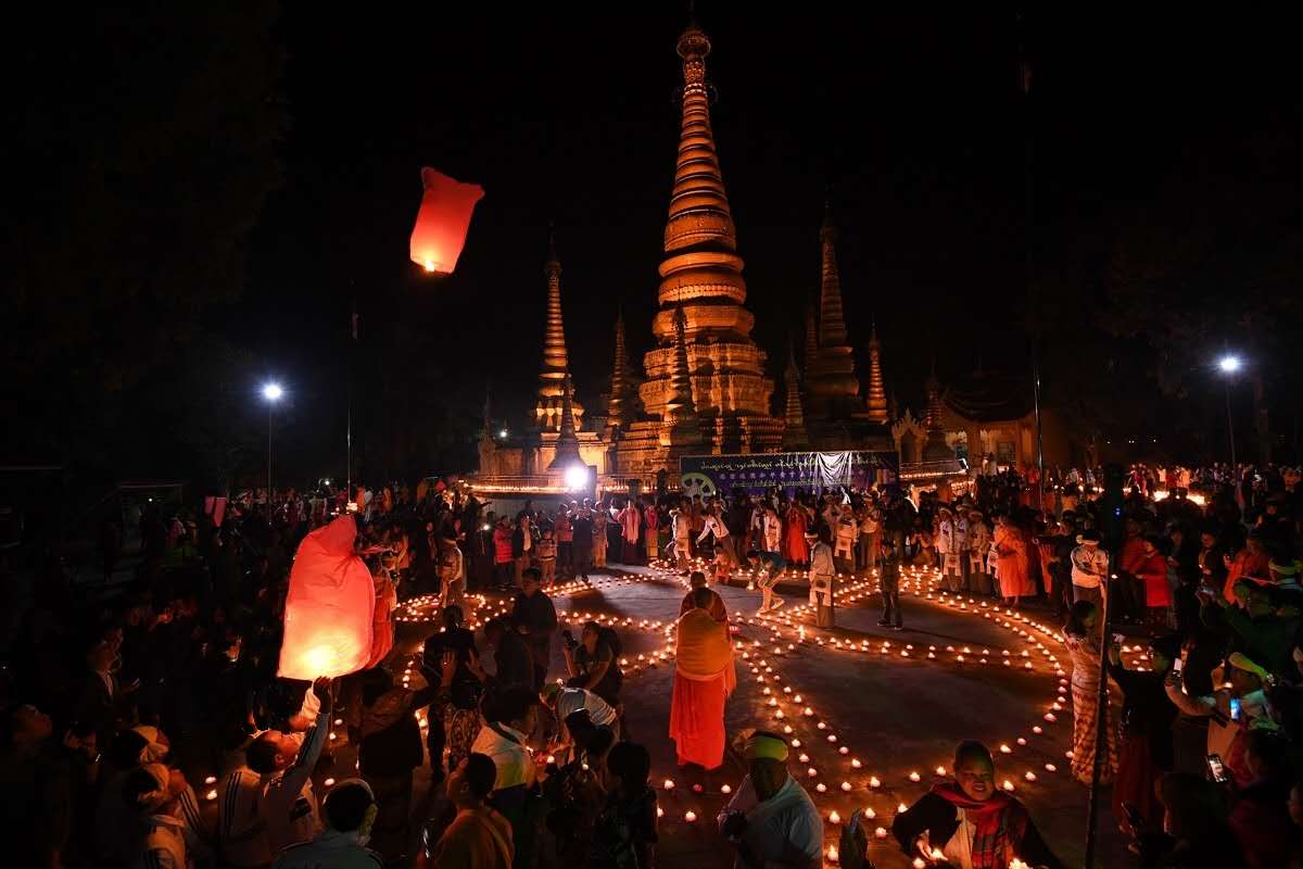 姐勒大金塔距瑞麗縣城5公里,姐勒鄉(xiāng)姐勒寨旁的小山上,有一座金碧輝煌的佛塔,極目遠眺,塔頂巍峨聳立,直插云霄,它就是姐勒金塔,據(jù)傳此塔是在2500年前,勐卯國國王召武定執(zhí)政時建造的,是瑞麗最古老的佛教建筑。相傳,很久以前,在金塔地基處,每當月明星稀之夜,其地就發(fā)出閃閃光芒,五光十色,極為奇麗,令世人大為驚奇。倔地一看,方知是佛祖遺留的舍利。于是眾佛教徒集資在倔出遺骨的地方建造一塔,旁邊建造一棟奘寺,以示祀意。自此,姐勒金塔天天香火不斷,鮮花綠葉不衰。勐卯土司也在金塔做一年一度的佛事大擺,并代代相傳。建塔之初,塔身用土坯建造,主塔高10余米,周圍以數(shù)小塔圍之。后經(jīng)歷代土司主持在其基礎上進行不斷的整修和裝飾,到民國年間,10余米主塔高高聳立,其外環(huán)列17座小塔,外表涂上金粉,主塔頂冠貼以金箔。塔基圍有一圈石欄,四周置石雕獅像,塔周古樹參天,見者無不為之贊嘆。然而,1969年,這百年石塔卻毀于一旦。