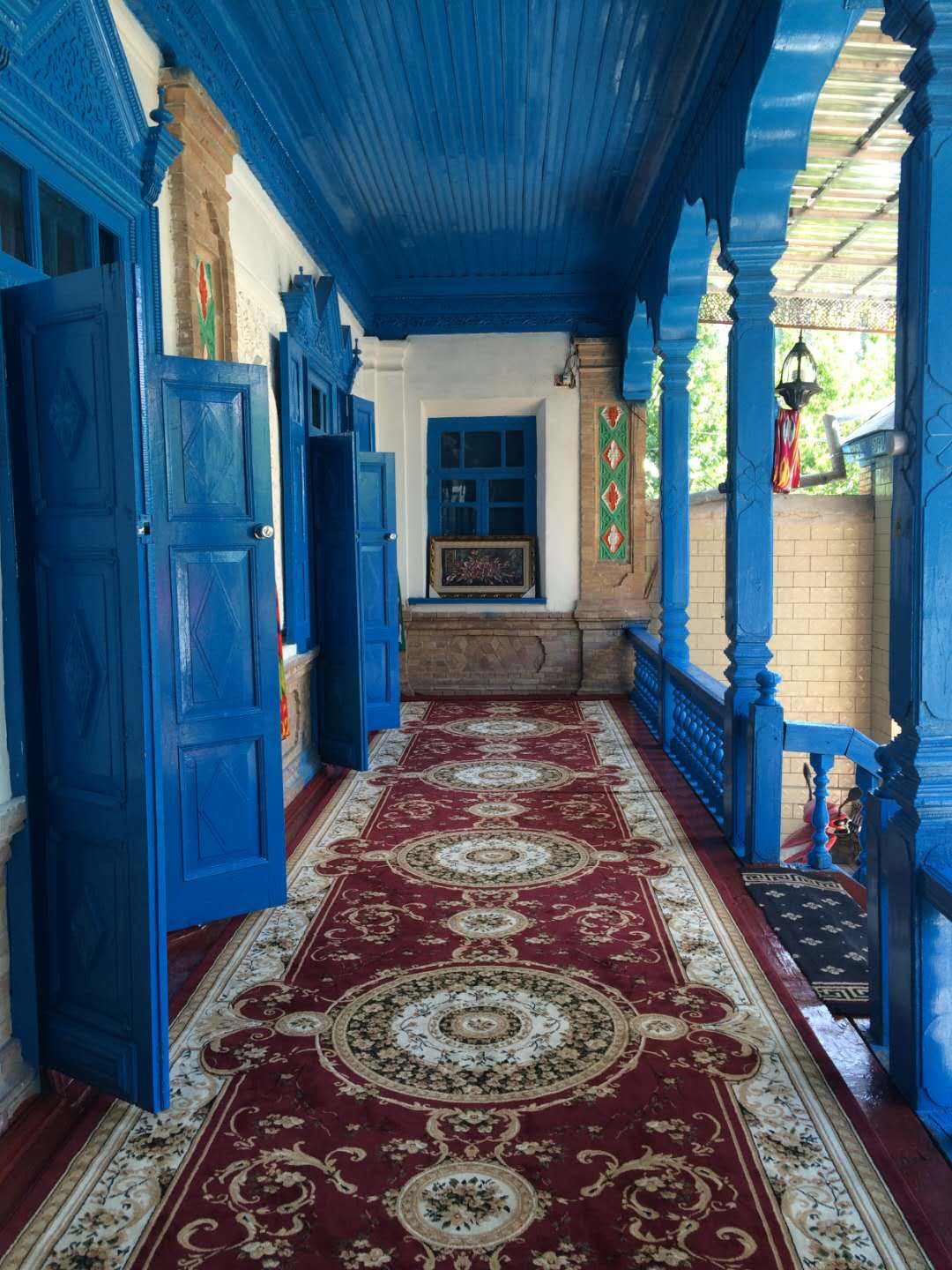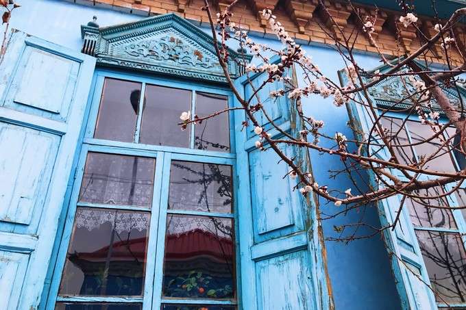 這里的民居與環(huán)境始終保持著較為完整的傳統(tǒng)風貌與格局,頗具中西亞特色及“塔蘭奇”傳統(tǒng)文化風格??澠涞姆课萁ㄖλ{色的使用頻率非常高,或者在外墻,或者在屋頂,更多時候是在門板和窗欞,藍色大都是主色調(diào),整個建筑顯得精致而純凈。