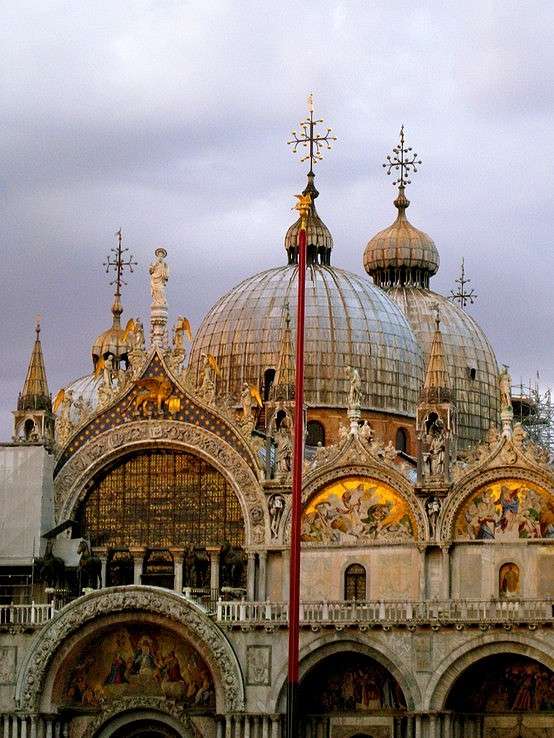 巍峨壯觀的圣馬可大教堂坐落于廣場(chǎng)東邊,圣馬可廣場(chǎng)即由此而得名。教堂始建于公元829年,為千年的古跡瑰寶,值得游客一再走訪。鄰近的總督府原是建于9世紀(jì)的防御堡壘,后毀于祝融,現(xiàn)存的外貌始于14至15世紀(jì),其建筑之華麗,充分展現(xiàn)出昔日共和國(guó)時(shí)期之國(guó)威。大運(yùn)河環(huán)繞該區(qū)而流,在南彎道兩旁府邸林立,乘船游河能遍覽水都風(fēng)華。內(nèi)部的藝術(shù)收藏品來(lái)自世界各地的,因?yàn)閺?075年起,所有從海外返回威尼斯的船只都必須繳交一件珍貴的禮物,用來(lái)裝飾這間「圣馬可之家」。