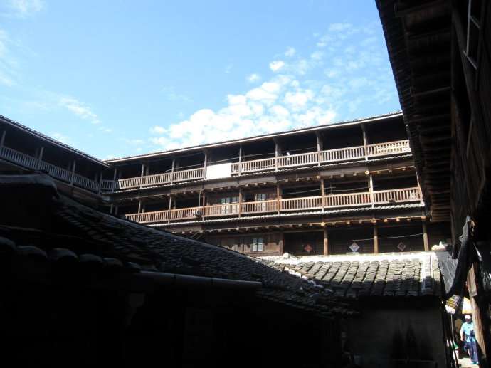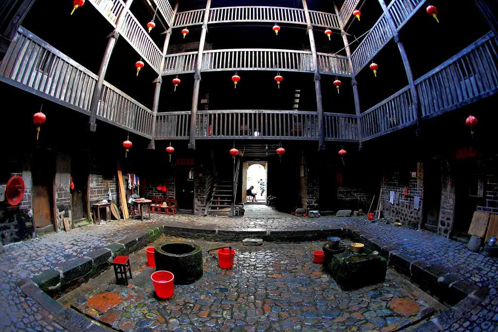 亦有五鳳型,橢圓型,八卦型,永定最多,將近二萬多座。南靖亦有一萬五千多座。永定以客家人為主,南靖為閩南人.土樓內(nèi)有水井和排水,門大多只有一個,多的有3個。房間的窗戶較小。遠(yuǎn)處看去就是一個堡壘。門比較結(jié)實,大多包了鐵皮,晚上大門一關(guān),非常安全。土樓的中間是祠堂,祠堂有的是獨(dú)立的。