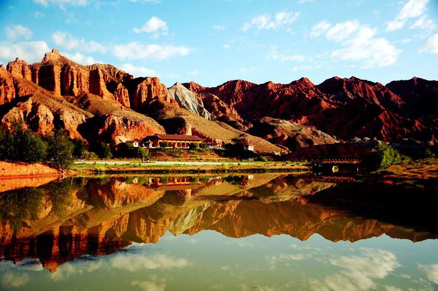 距西寧70公里,交通便利、氣候宜人、景色秀美。 貴德位于黃土高原與青藏高原的過渡地帶,黃河自西向東橫貫縣境中北部,流程76.8公里。在貴德境內(nèi),溝壑縱橫,山川相間,呈現(xiàn)多級河流階地和盆地丘陵地貌。它,恰好處于黃河谷地,南北高,中音像工,群山環(huán)抱,上有龍羊峽鎖關(guān),下在松巴峽守護(hù),四面環(huán)山,平川開闊,土地肥沃,素有高原“小江南”之稱。丹霞地貌在貴德有數(shù)處,最著名的是阿什貢峽。 阿什貢峽自山谷狹長的羊圈灣開始,西至達(dá)卡溝口。峽內(nèi),尕讓河像一條黃色的帶子蜿蜓南下。由于河水的切割,兩岸山巒多為斧劈刀削般的懸崖,加上一些風(fēng)蝕砂巖和較為平緩的山坡,重重疊疊,火紅火紅,綿延數(shù)十里,十分壯觀,至峽口,兩側(cè)山巒成為約50米高的絕壁,筆直的崖面上清晰地呈現(xiàn)出當(dāng)年沉積層的水平線條。那崖頂被雨水沖刷出許我溝壑,有的像塔林,有的像歐式滿面春風(fēng)頂樓房。 峽口,又稱“石門”,兩壁對峙,相距不足百米,兇險(xiǎn)異常,而這“一夫當(dāng)關(guān),萬夫莫開”的天險(xiǎn),又好似歷經(jīng)戰(zhàn)火,被“燒”得紅彤彤的。 阿什貢丹霞地貌當(dāng)然不會與戰(zhàn)爭有關(guān),它們是地球內(nèi)外營力的杰作。
