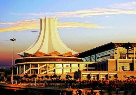 在會議中心首層,分布著5個大型會議廳,分別為101-105號會議廳,它們的結(jié)構(gòu)布局恰好形成了一個完整的圓形,周邊還設(shè)有餐廳等附屬設(shè)施。101號會議廳為國際報告廳,在5個會議廳中最為搶眼,它呈下沉式、階梯型,使用面積590平方米,可容納400人。該廳以棕色和黑色為主色調(diào),給人以強烈的莊重感,紅色座椅按從低到高、從窄到寬的扇形來布置,無論哪個角度都能保持良好、不受阻擋的視線。在所有會議廳中,它所配備的設(shè)備也是最為先進的,擁有7+1同聲傳譯系統(tǒng),可以滿足國際會議的多語種翻譯需要。