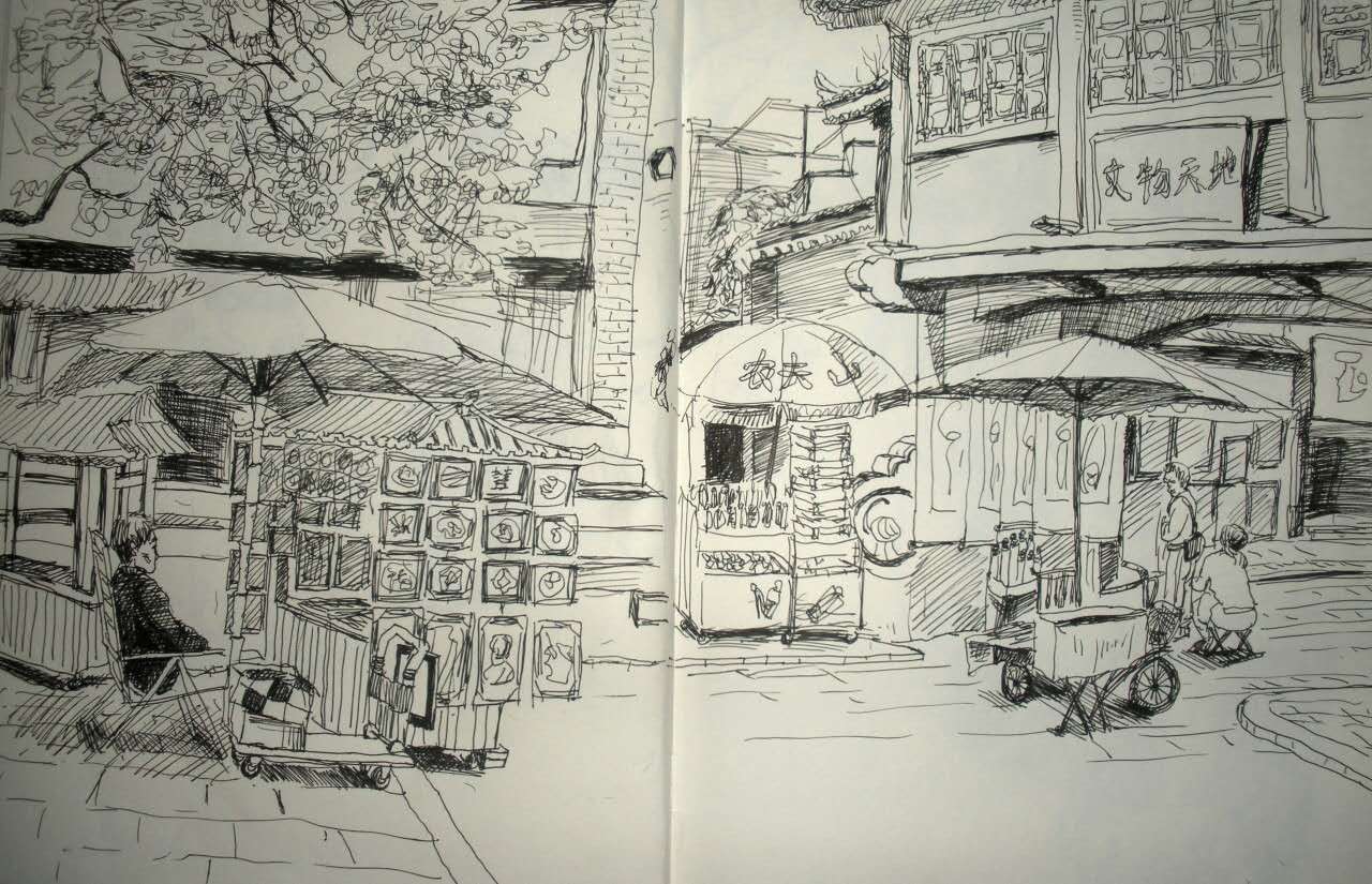 從南大街走到這條街上,忽然好像一下子安靜了下來。路兩邊,高大的槐樹后面,紅漆格子門半開著,大大小小的湖筆從門檐上面垂下來,后面是一張怡然自得的臉,表情似曾相識。青石板的路面緊貼著鞋底,松動的地方發(fā)出清脆的烏烏聲。潑墨山水掛在城墻的青磚墻上,斑駁的陽光灑在上面,隨風輕輕抖動。