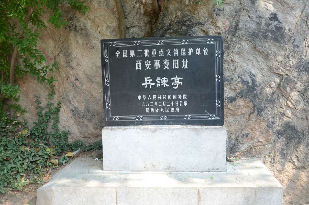 這座高4米,寬2.5米的石亭,建于1946年3月,由胡宗南發(fā)起,黃埔軍校七分校全體士官募捐而成,名曰“正氣亭”,解放后,該亭更名為“捉蔣亭”,1986年12月在紀(jì)念“西安事變”50周年前夕,為了緩和兩岸關(guān)系,再次易名為“兵諫亭”。