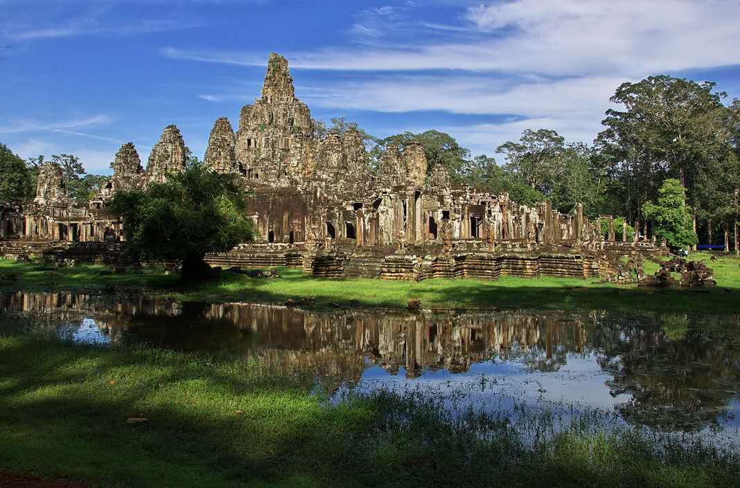 (圖為吳哥通王城廢墟,寺名巴揚(yáng)寺(Bayon),以其四面微笑的佛像聞名于世,又稱“高棉的微笑”)