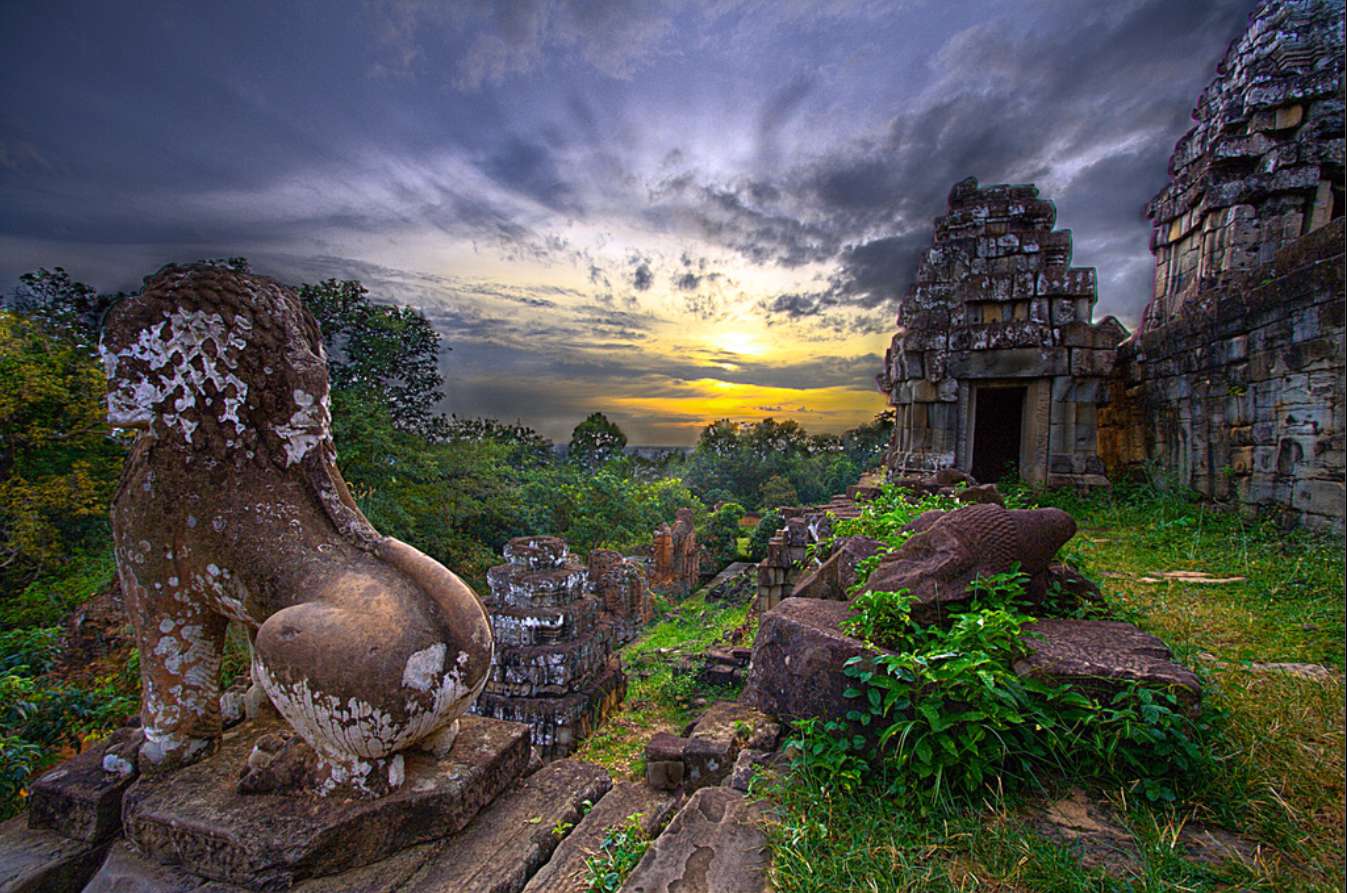 建于耶輸跋摩(889~910年在位)統(tǒng)治時(shí)期,這是吳哥幾座代表須彌山的寺廟(包括吳哥窟)中的第一座。盡管這兒仍然是拍攝遠(yuǎn)處落日余輝中的吳哥窟的絕對(duì)山頂位置,但令人傷心的是,如今的巴肯山神廟已經(jīng)熙來攘往,不再是看日落的最佳地點(diǎn)了??慈章漭^為安靜的地點(diǎn)是科榮寺(PhnomKrom)的寺廟群,從那兒還可以俯瞰洞里薩湖和比粒寺(PreRup)。