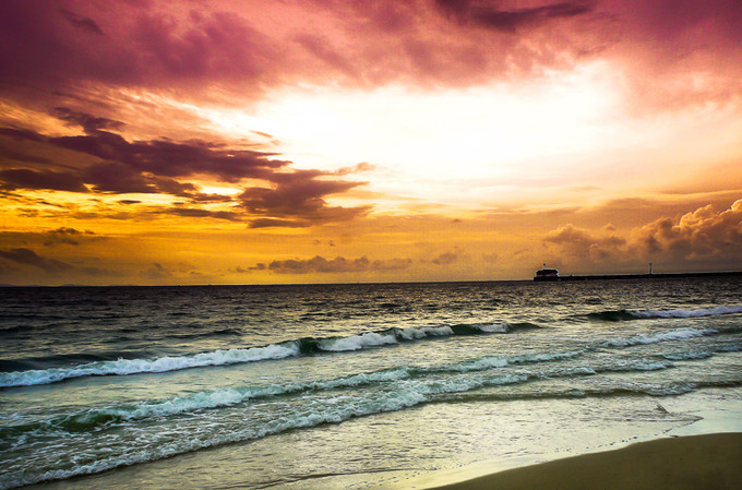 位于西哈努克城的西北角,勝利海灘超過2公里長,被礁石和小山分成兩段。其北段有大貨船來來往往,這里游客較多,是西哈努克看日落的最好地方,南段又稱夏威夷海灘、國王海灘,可在此租船出海。