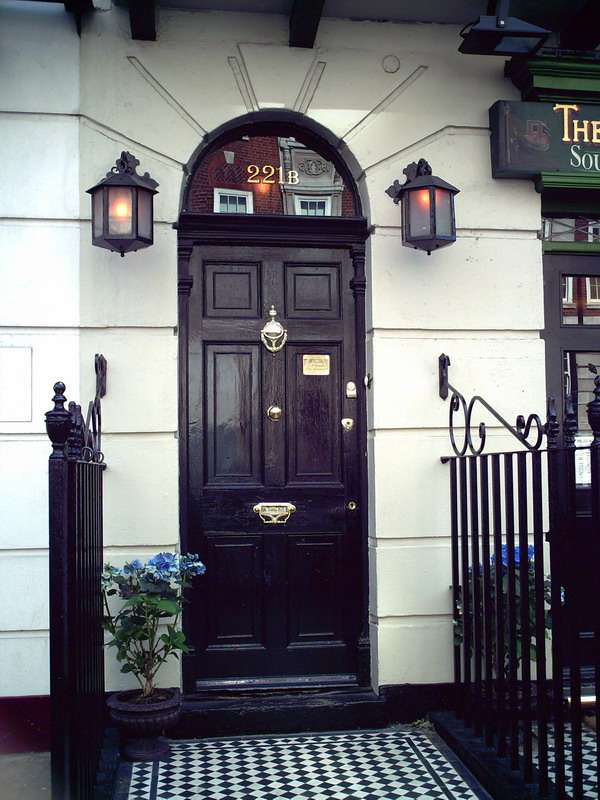 說起貝克街、福爾摩斯他們所居住的221b是很有名的、但當(dāng)時貝克街是從東側(cè)從南到北有1號~42號、西側(cè)由北到南是44號~85號。并不存在221號。也就是說221b只是作者制造出來的虛幻的地方。順便說一下、221b的“b”并不是英文字母“b”,而是法語中的bis(~2)的意思、221地址是表示有2戶人家的記號。當(dāng)前的貝克街221b是金融公司(ABBY NATIONAL)、鄰接的場所建有夏洛克·福爾摩斯的住所。